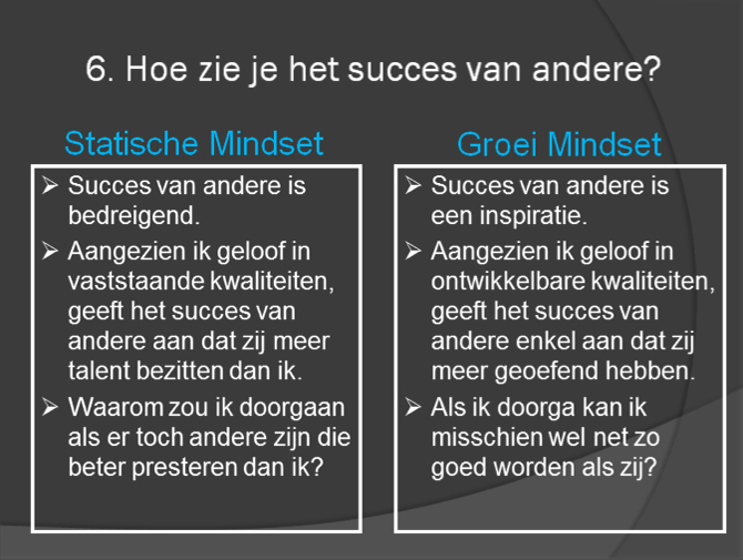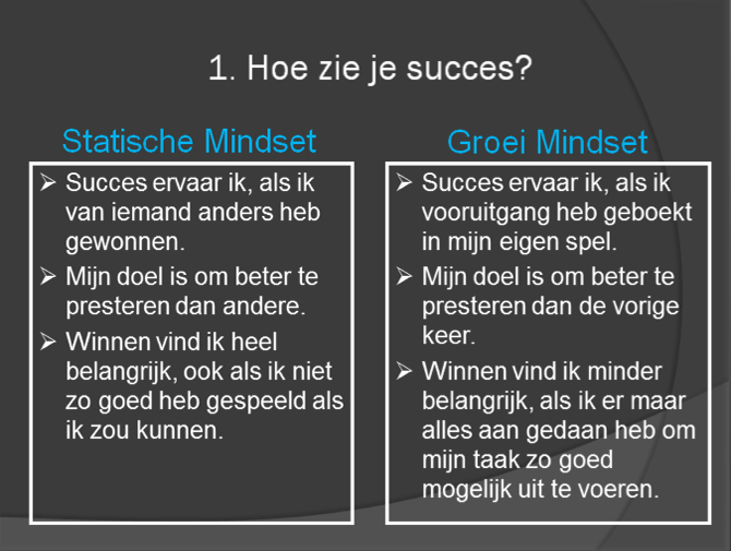 Bezit jij de statische of de groei mindset? De mindset die jij bezit klinkt door in de voorbeelden die je geeft aan kinderen. Welke voorbeelden vertel jij als trainer/coach/ouder aan een sporter? Verhalen over een natuurtalent dat op zijn twaalfde al heel erg goed was in zijn sport zonder er veel voor te hoeven doen. Hiermee stimuleer je de statische mindset.