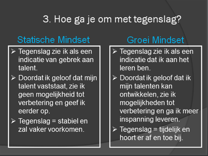 Hieronder zijn de gevolgen van de twee verschillende mindsets overzichtelijk weergegeven.