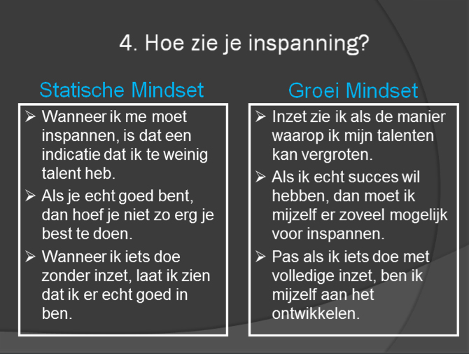 • In de groei mindset gaat iemand er daarentegen juist vanuit dat vaardigehden te ontwikkelen zijn. Door veel te oefenen en te leren van fouten wordt je ergens steeds beter in. “Hoe meer ik mijn best doe, hoe beter ik zal worden. "