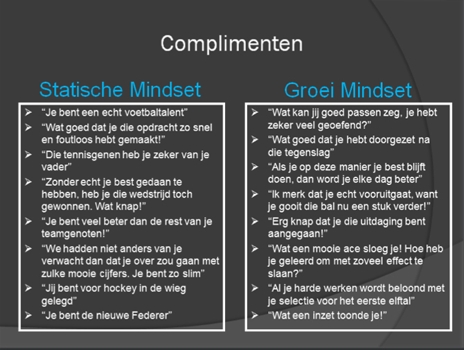 Het probleem is dat deze statische mindset vaak onbewust door ouders/trainers/coaches werd gestimuleerd door de statische complimentjes die ze altijd gaven aan de sporters.