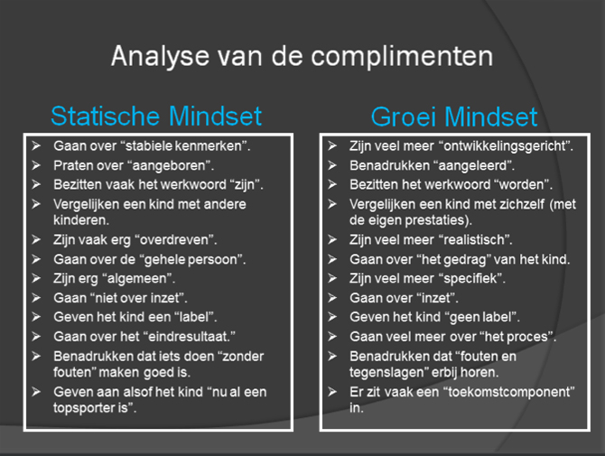 Zoals uit de voorbeelden hierboven blijkt zijn er aardig wat verschillen tussen de soorten complimenten die de twee mindsets stimuleren. Na een analyse blijken dit de ste verschillen tussen de twee soorten complimenten te zijn: